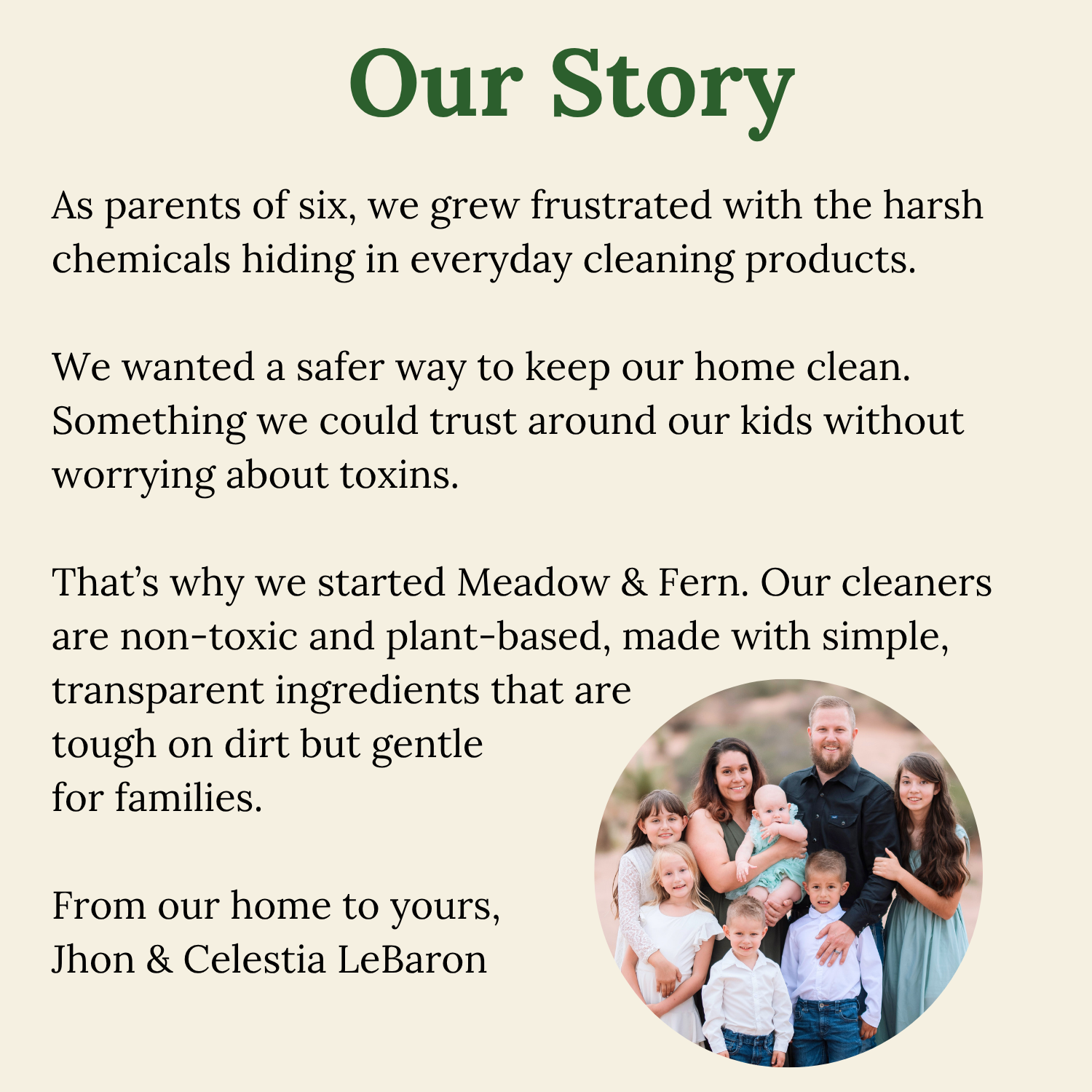 We started Meadow & Fern because we were tired of harsh chemicals lurking in everyday cleaning products—especially around our kids. So, we created safe, plant-powered cleaners that actually work, without the toxins. Because a clean home should feel fresh, healthy, and worry-free.